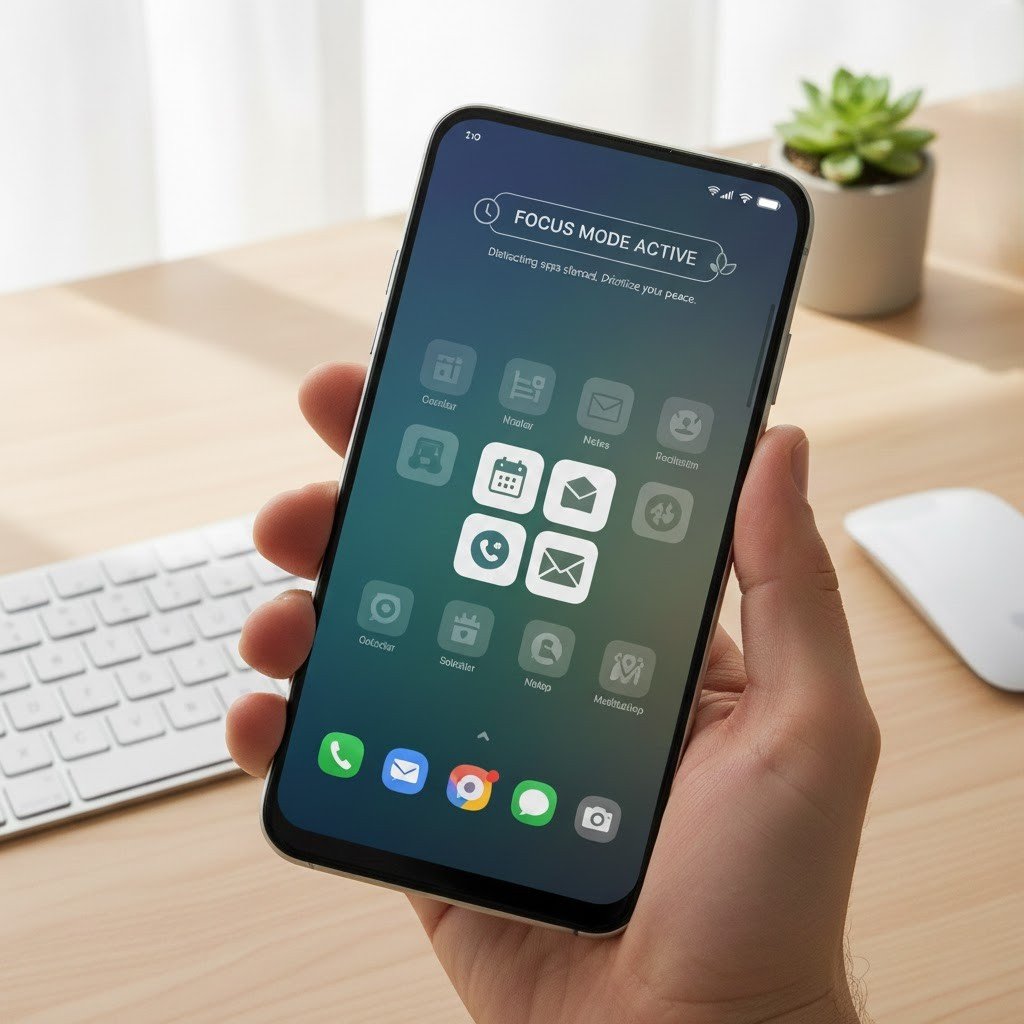 Focus Mode temporarily pauses distracting apps. It supports productivity by allowing only essential tools, helping users stay attentive during work, reading, or quiet personal time.