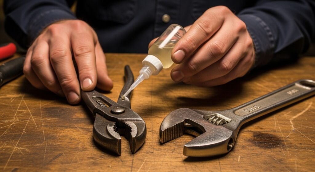 Apply machine oil on hinges and pliers and any tools that can be adjusted. This prevents hardness, rust and unnecessary wear of friction.