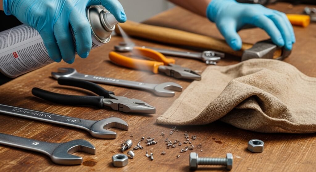 Use metal tool rust-resistant sprays or coating. To store wrap tools in cloth or protective paper to be used in the long term.