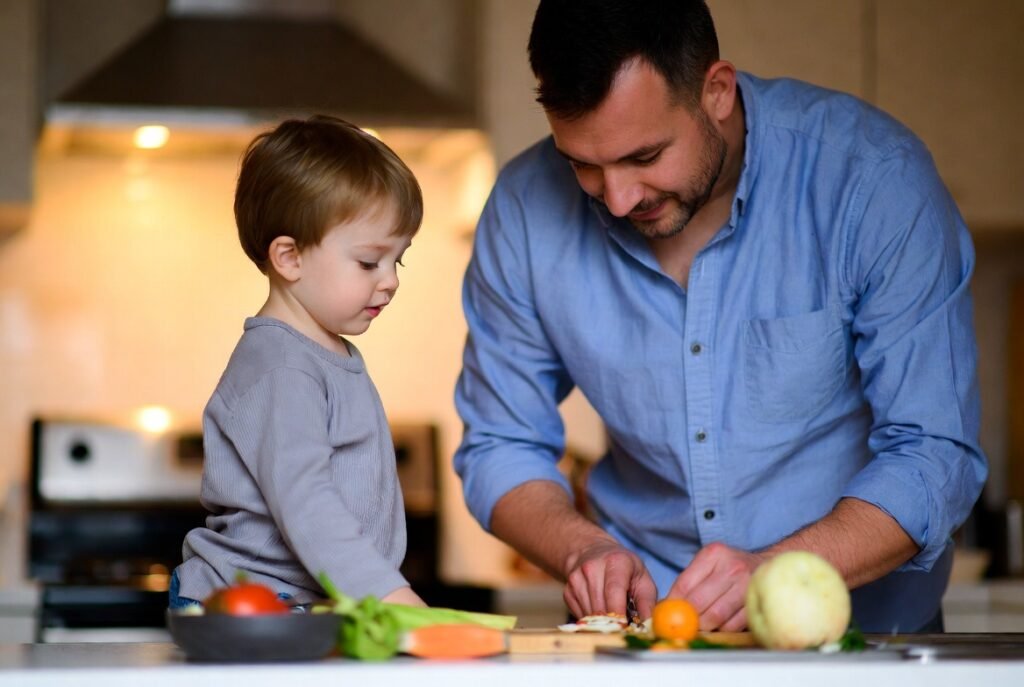 Preparation of food is a sign of affection and participation in everyday activities. A cooking father knows that there is food in other forms. It shows teamwork, responsibility and respect for that which works as a family.
