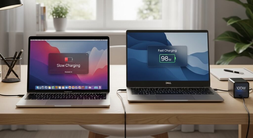 There are USB-C cables that can only charge slowly. There are also others that cope with high wattage power delivery (PD) which is necessary in powering up laptops and other bigger devices in a fast and safe manner.
