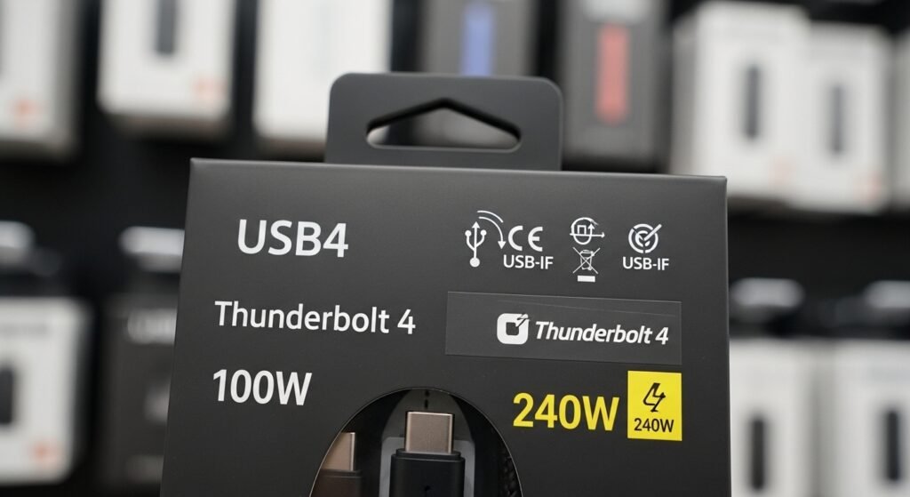 Rather than snatching the least expensive cable, make sure it is clearly labeled: USB4, Thunderbolt 3/4, power output (e.g. 100W or 240 W), certified logos. Brand hype is not so important as those details.