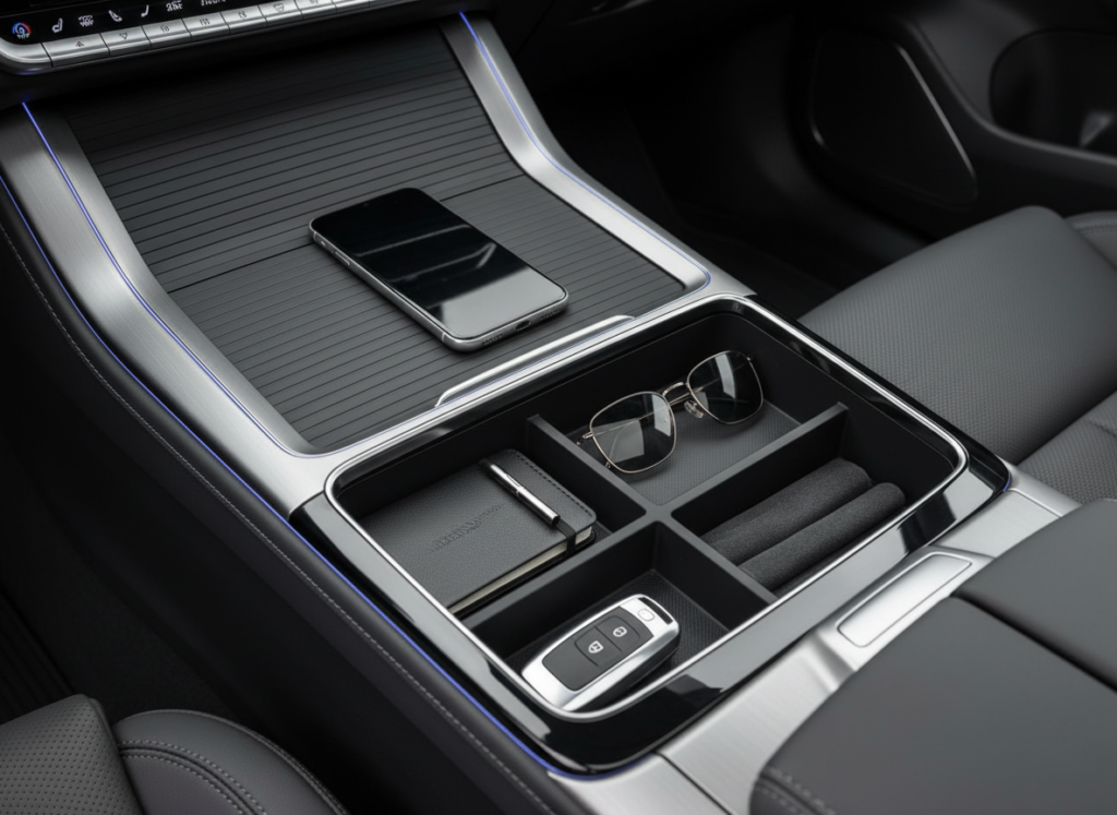 This organiser has an integrated charge wirelessly and storage. It charges phones without using cables and also eliminates clutter, thus leaving the centre console cleaner and easier to manage.