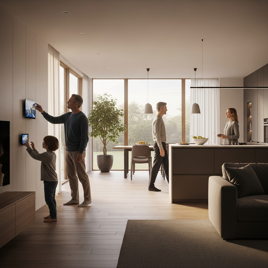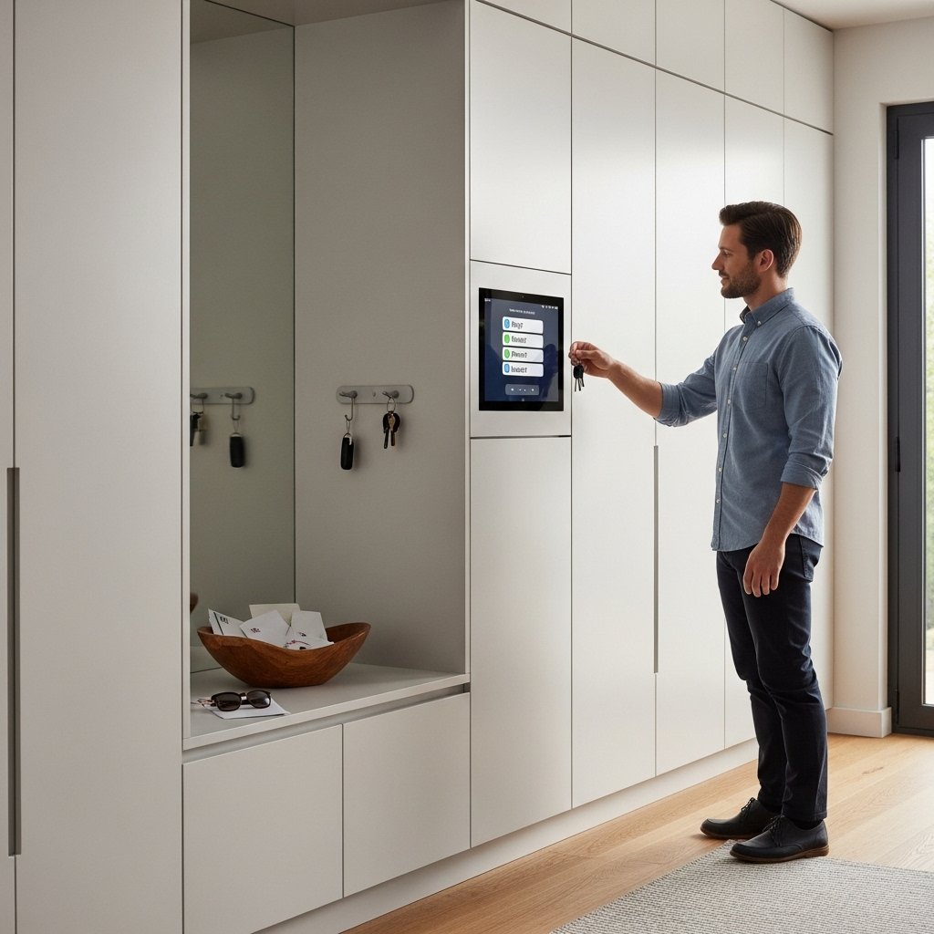 Built into entry cabinets, this system tracks keys, bags, and daily essentials. Subtle reminders appear on a small display, helping reduce morning delays without relying on constant notifications.