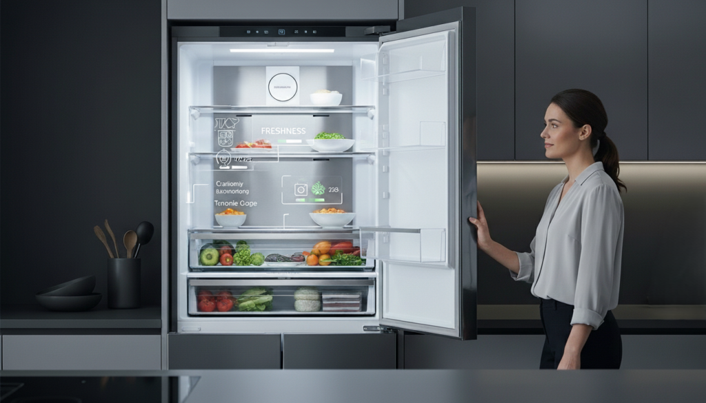 Internal sensors track temperature zones and food placement. The refrigerator suggests optimal storage spots and alerts users before items lose freshness, helping reduce waste without changing shopping habits.