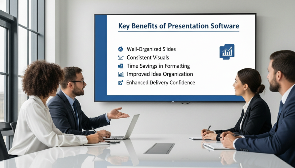 Presentation software assists in making slides well-organised. They are consistent in visual appearance. Professionals conserve time in formatting. Ideas appear more organised. This helps in delivering confidence when the internal reviews are done, when discussing with the clients and during the leadership meetings.