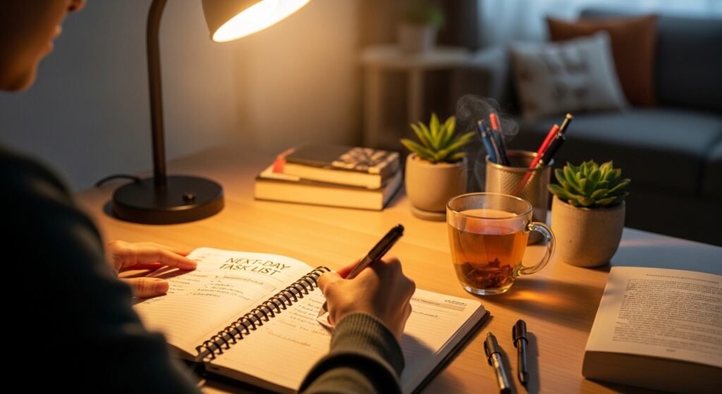 A basic schedule of the following day will help to decrease stress and enhance productivity.