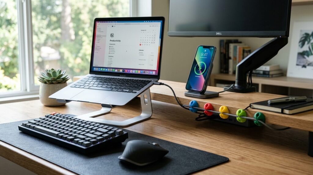 Sometimes untidy cables may easily transform any working area to a frustrating area. Basic cable management products ensure the wires are well organized and therefore make the desk look better and enhance efficiency. They also save the time of knotting cords and locating the appropriate charger.