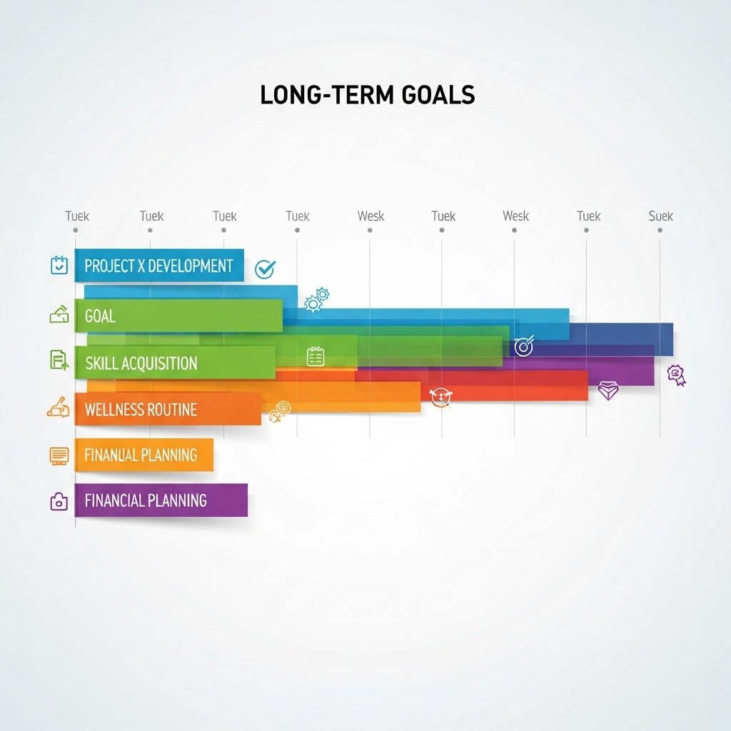 The calendar system contains recurring time blocks which enable users to schedule their long-term objectives. The system allows users to see their current tasks while they work towards their main objectives which helps them maintain a constant pace of development.